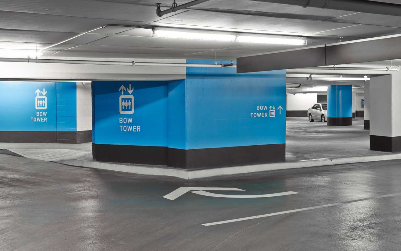 The six-level underground Bow Parkade spans two full downtown city blocks. The wayfinding and signage system features colour-coded levels, large environmental graphics, clear and effective vehicular signage, as well as bicycle road markings.